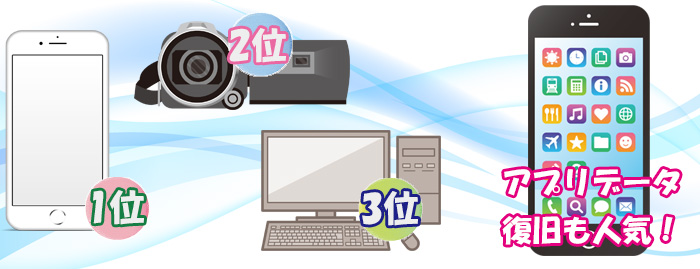 iPhone、iPad、スマホ、タブレット、パソコン、外付けハードディスク、ビデオカメラ、防犯カメラ 、SDカード、USBメモリー、カーナビGPS、ゲーム機、ブレーレイ、ボイスレコーダー、電話帳、写真、動画、ライン、ゲームアプリ、その他アプリ等